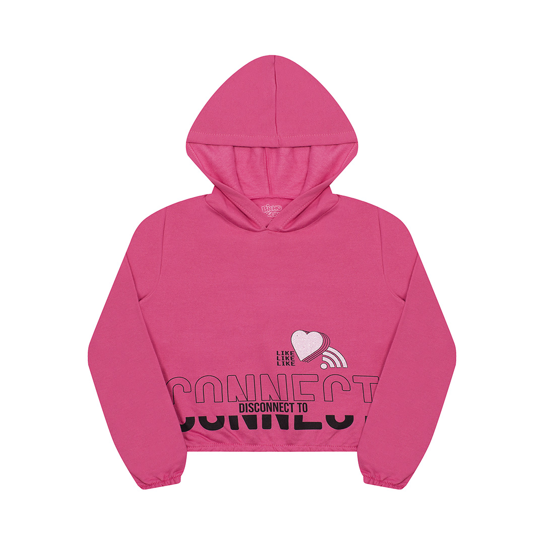 Tecido em moletom, capuz, punho e barra com elástico, estampa com detalhes com glitter e com escrita: “Like Connect, disconnect to”.