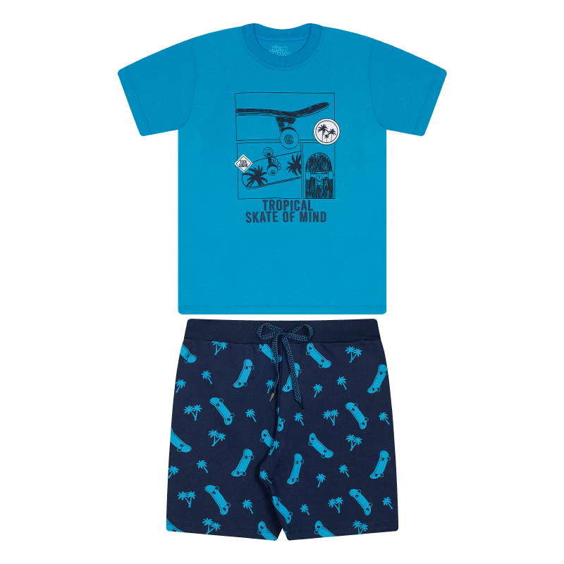 Conjunto para meninos composto por uma camisa em meia manga, meia malha, gola redonda, com detalhe de puff na estampa de skate e escrita "Tropical skate of mind".