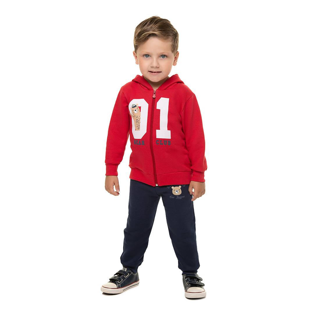 O casaco é feito de moletom, peluciado na parte de dentro, detalhe de puff na estampa, barra e punho de ribana e estampa de ursinho com escrita: ”Bear Club”.
